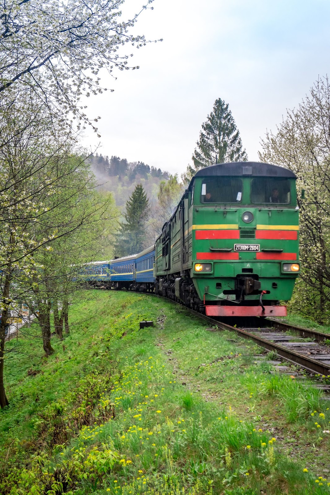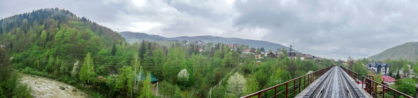 Ехали в Ворохту прямым скорым поездом Харьков — Рахов. После Ивано-Франковска поезд едет в горах, дорога петляет. Поэтому из последнего вагона видно первый, а за окном необычные для жителей равнинных районов Украины пейзажи: горы, горные реки, мосты-виадуки, обрывы и водопады. Дорога на этом участке вплоть до Рахова очень живописная. Поезд едет в гору тяжело и медленно. Тянет поезд тепловоз, так как после Ивано-Франковска железная дороге не электрифицирована.
