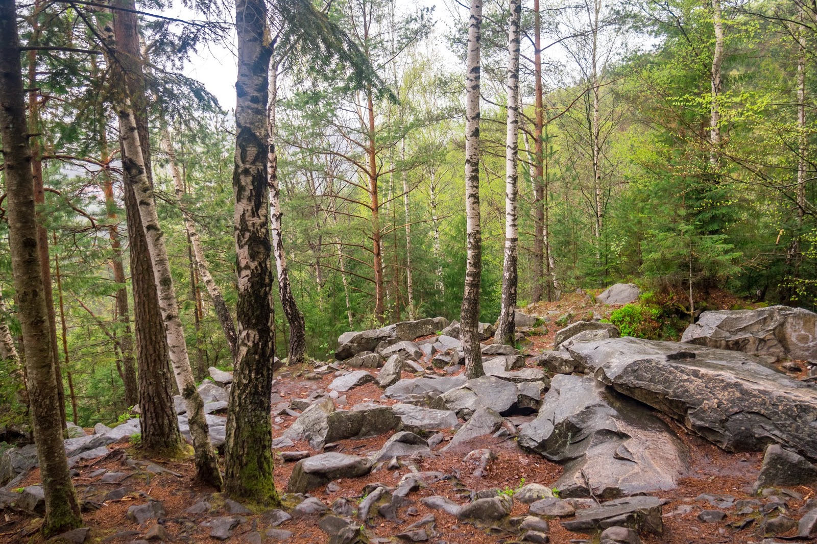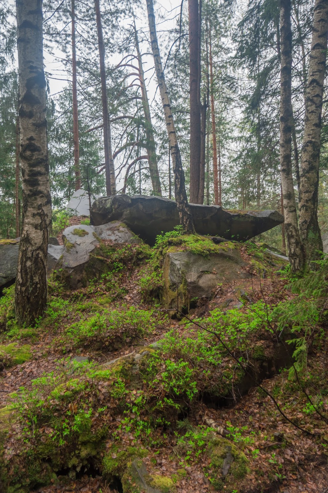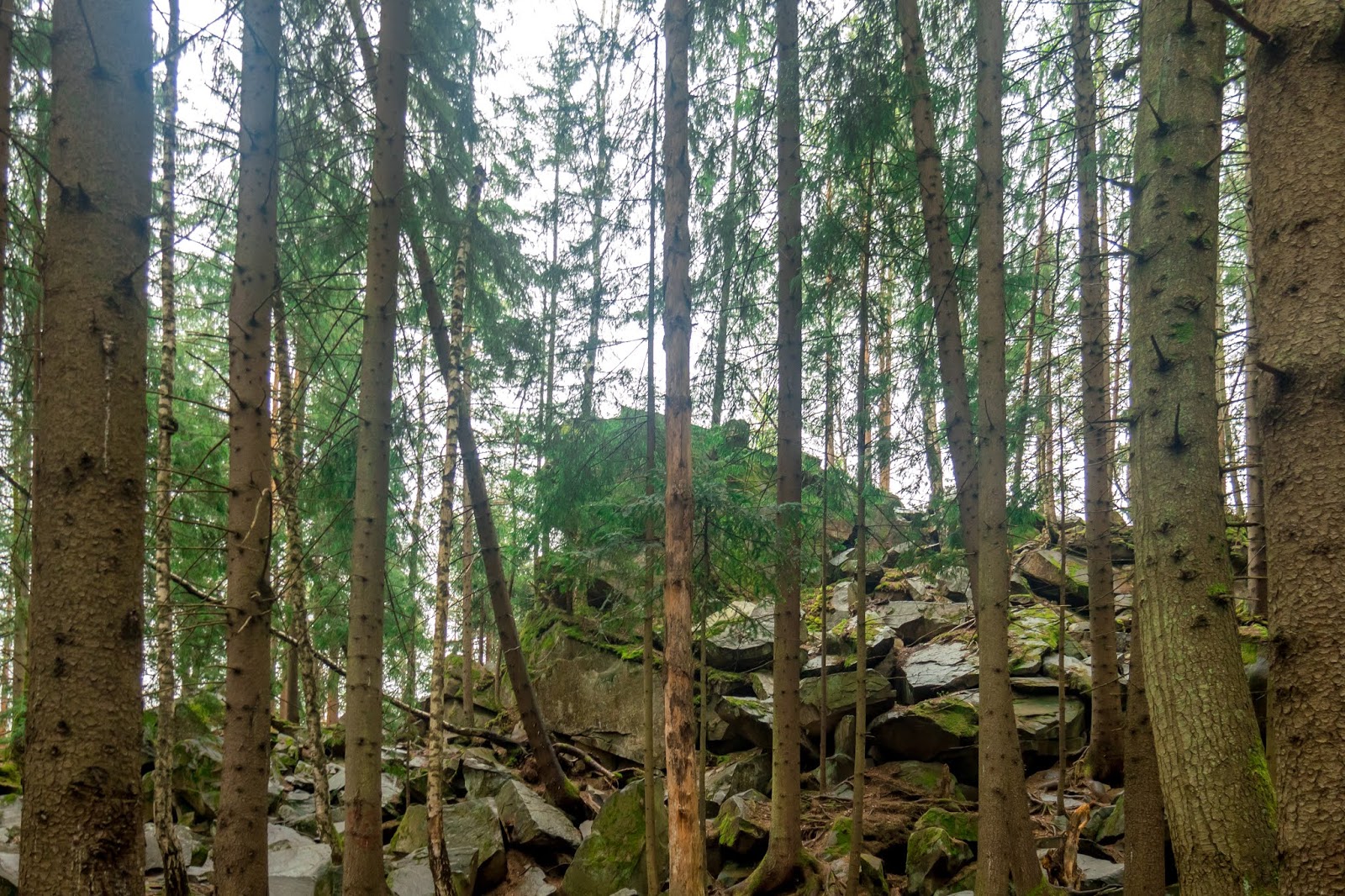 Тропа Довбуша проходит среди огромных обломков горной породы. Окружающий пейзаж напоминает какой-то фантастический фильм: