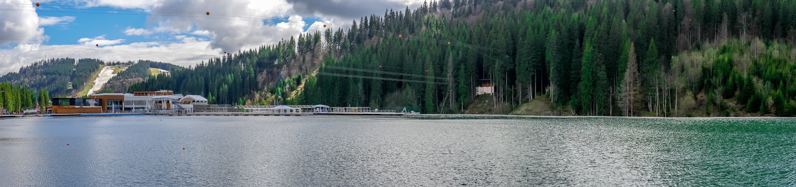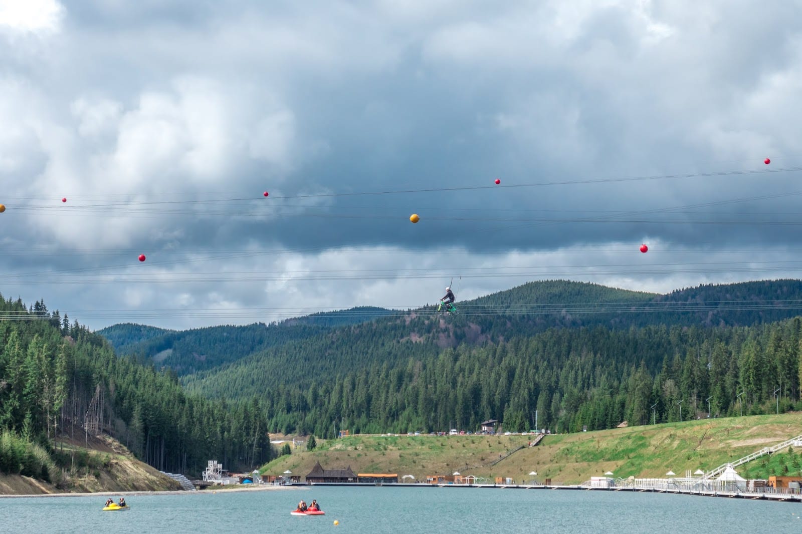 После подъемников мы пошли дальше в поисках достопримечательностей и пришли на искусственное озеро Молодости, где среди прочих развлечений предлагался зип-лайн на велосипеде, но так как зип-лайн в этом путешествии у нас уже был, то мы просто пофотографировали проезжающих мимо в воздухе велосипедистов: